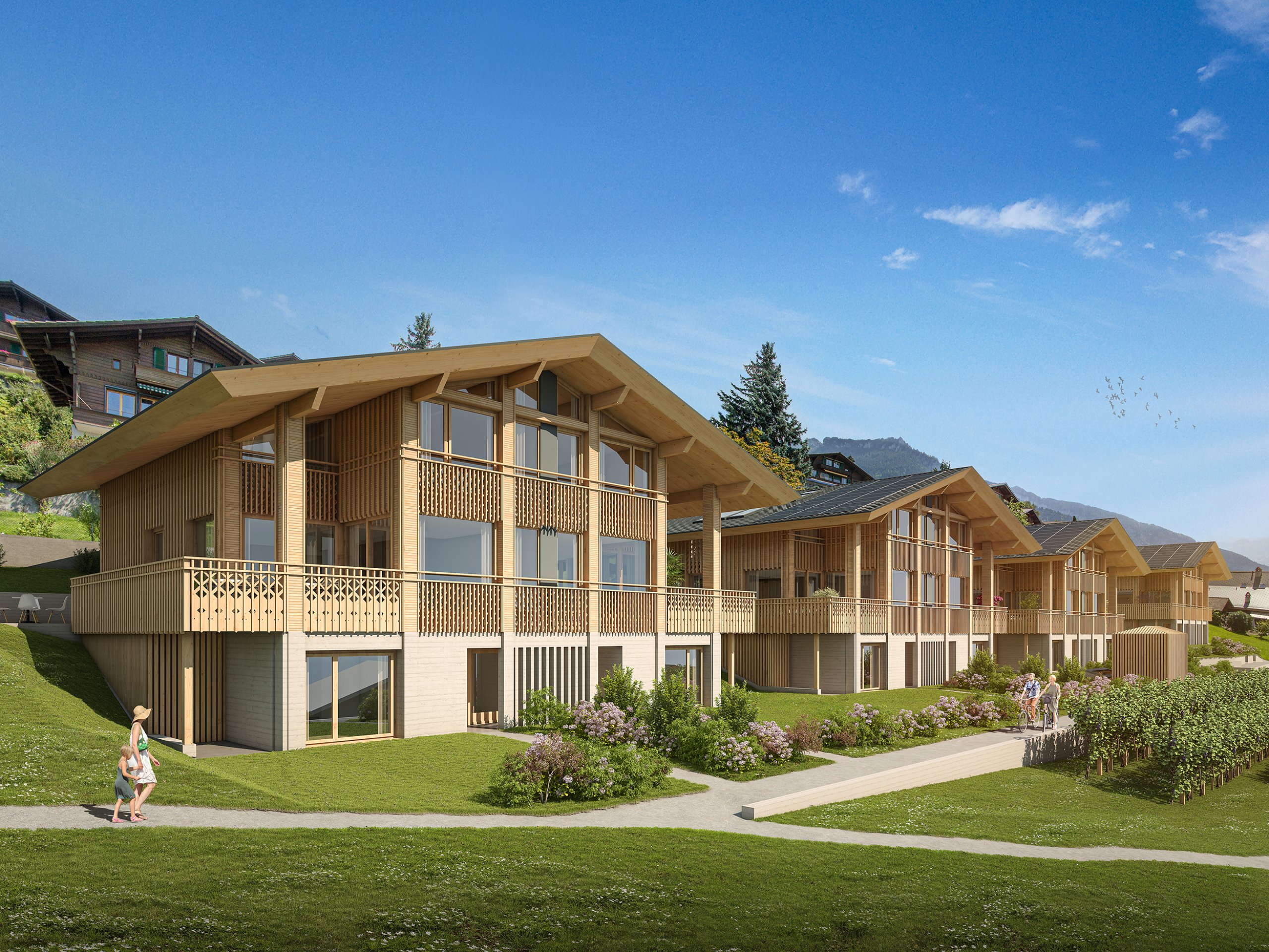 Traditionelle Formen werden zeitgemäss interpretiert und an heutige Wohnbedürfnisse angepasst. So schafft die Laubentypologie private, gedeckte Aussenräume, die den Blick auf das eindrucksvolle Berg- und Seepanorama an bester Südlage öffnen, zugleich aber durch eine feingliedrige Holzstruktur vor Einblicken schützen. Für heisse Tage bieten die Doppelhäuser zusätzlich zurückversetzte, private Aussenplätze.