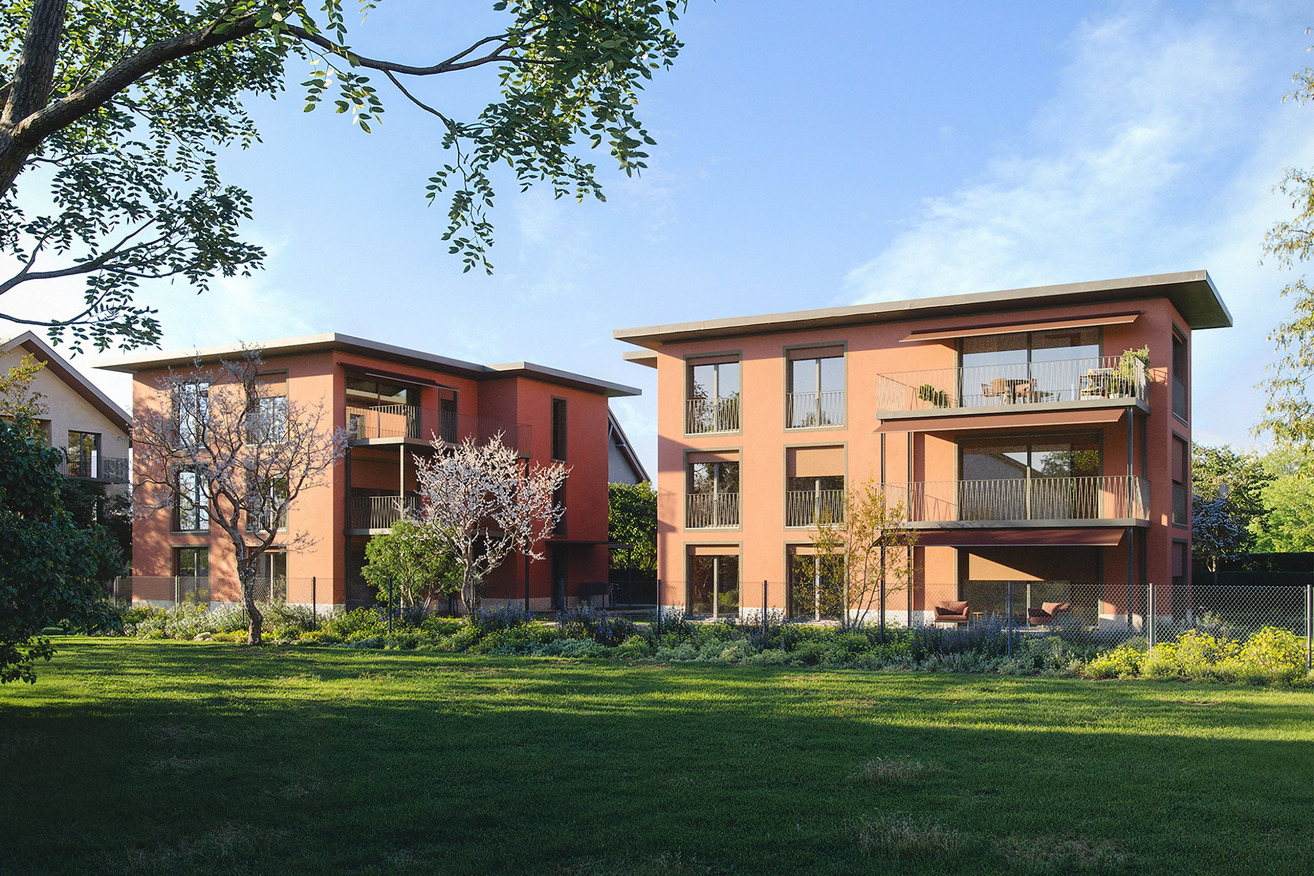 Die beiden Gebäude überzeugen durch eine klare, kubische Formsprache. Hinterlüftete Flachdächer scheinen leicht über den Baukörpern zu schweben, während die ockerfarbene Fassade mit eleganten Balkongeländern und fein gestalteten Sonnenschutzelementen ein charaktervolles Gesamtbild prägt.